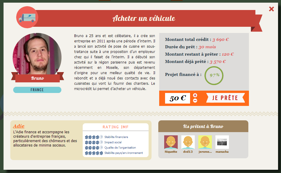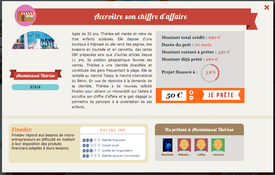 Cette initiative est à saluer et à encourager car elle permettrait à ces micro entrepreneurs, plutôt que de recourir à l’aide traditionnelle (et d’en rester dépendent), de se prendre totalement en charge et pérenniser leur affaire. A signaler également que 80% de ces micro-entrepreneurs sont des femmes. Ce qui selon moi revêt une importance capitale quand on sait la place qu’elle joue dans la famille. De plus, les sommes investies peuvent être relativement faible ; allant de de 50 euros à 1000 voire 2000 euros selon vos possibilités. Vous êtes totalement remboursés de votre investissement initial. Vous pourrez ensuite réinvestir cette somme dans d’autres projets ou simplement la récupérer si vous le souhaitez. A ce jour, selon Arnaud Poissonnier, fondateur de Babyloan, 100% des sommes investies ont été remboursées. Pas mal n’est-ce pas ? je vous invite a vraiment creuser la dessus. Pour ma part, je suis conquis. Et j’ose espérer qu’il en sera de même pour vous.