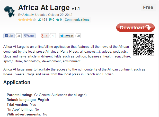 Cependant, pour améliorer l’expérience AAL, je proposerai l’introduction de la lecture de fil d’actualité Twitter mais aussi d’un ou plusieurs hashtag particulier type #civ2010 par exemple. Aussi, je pense que l’application gagnerait en introduisant la lecture de flux RSS directement depuis la plateforme. Cela permettrait aux lecteurs de s’approprier l’appli tout en diversifiant les sources de leur lecture. Du coup, on aurait son actualité quotidienne africaine sélectionné par Africa At Large, mais aussi les derniers développements de l’actu en Syrie, aux Etats Unis ou autre que nous aurions choisis nous-mêmes.